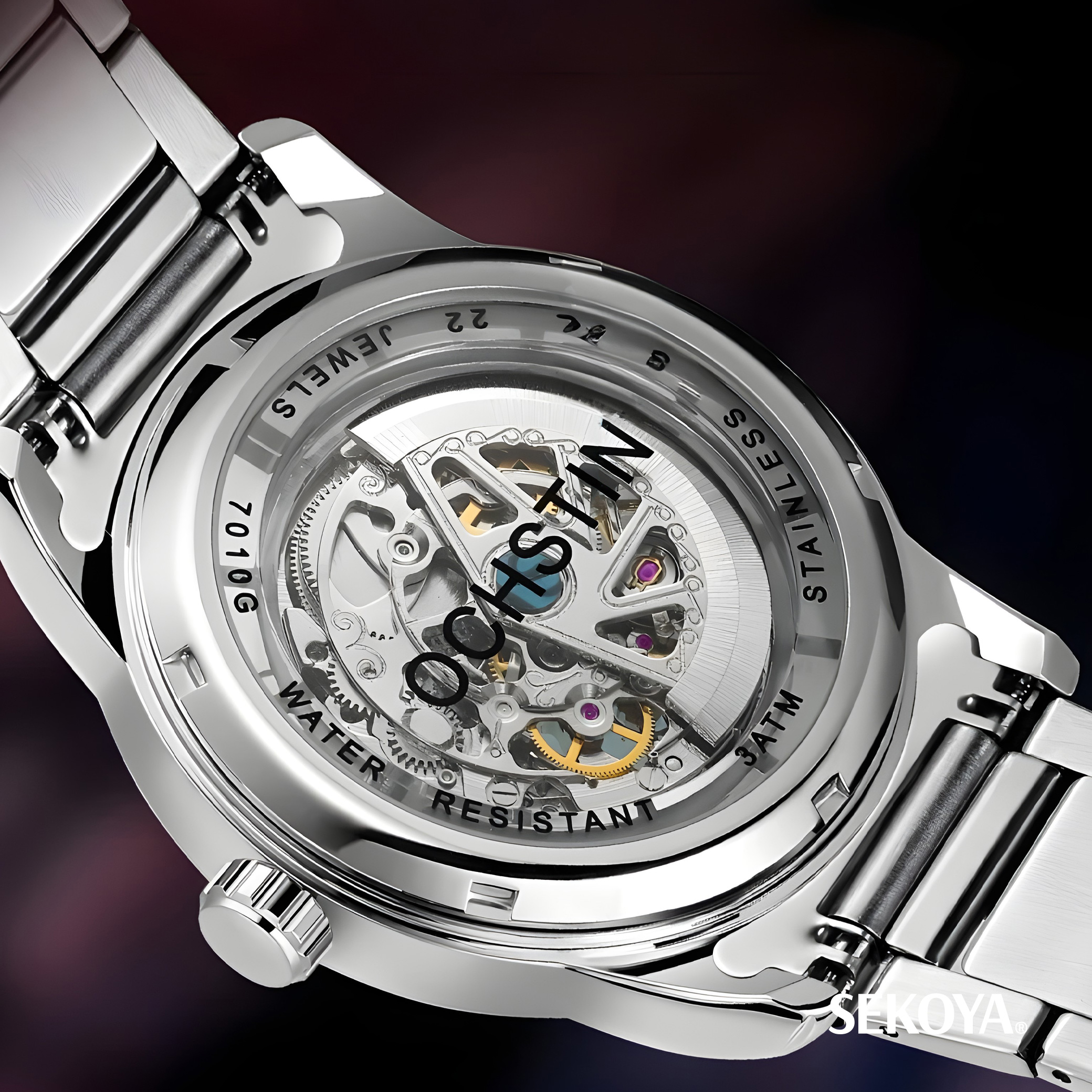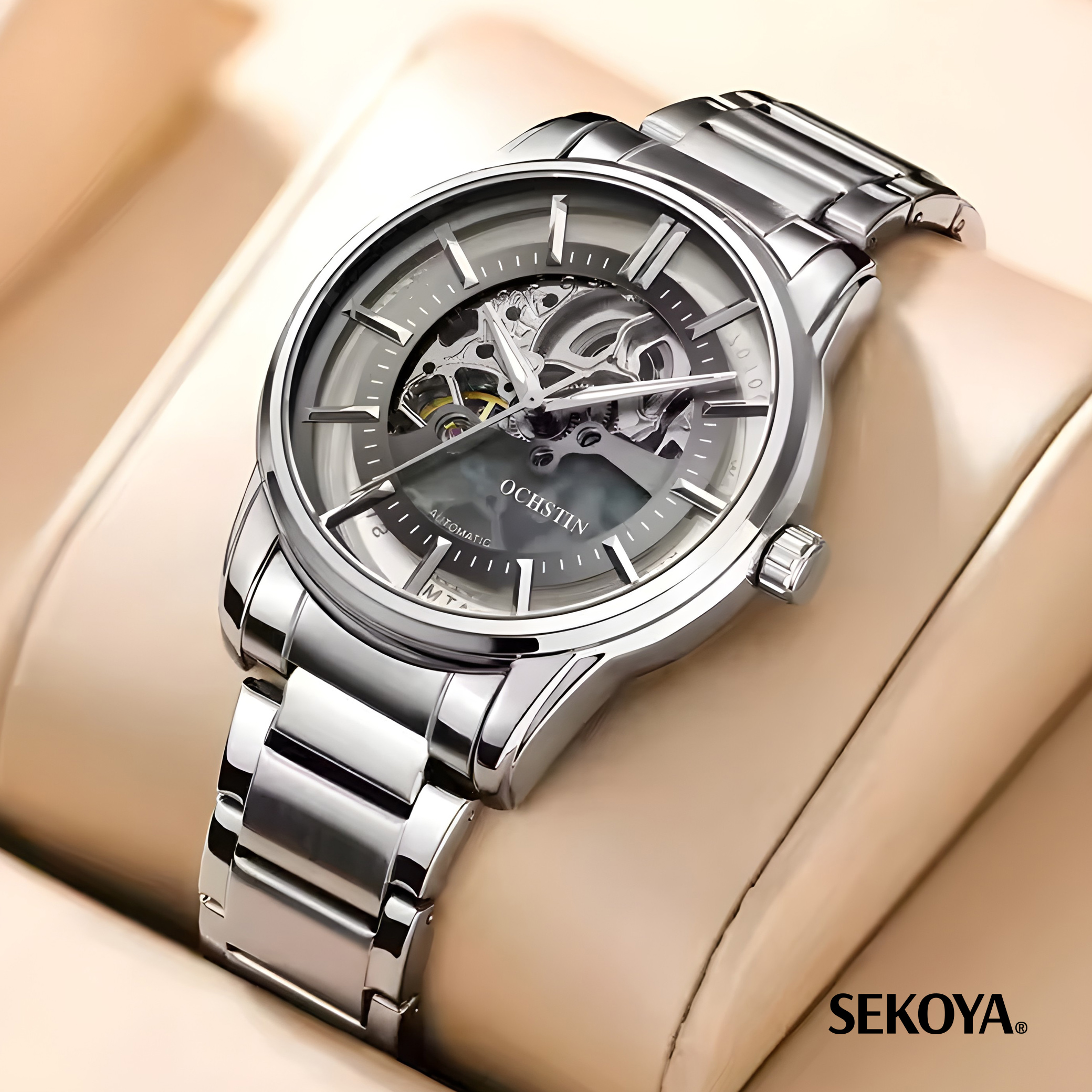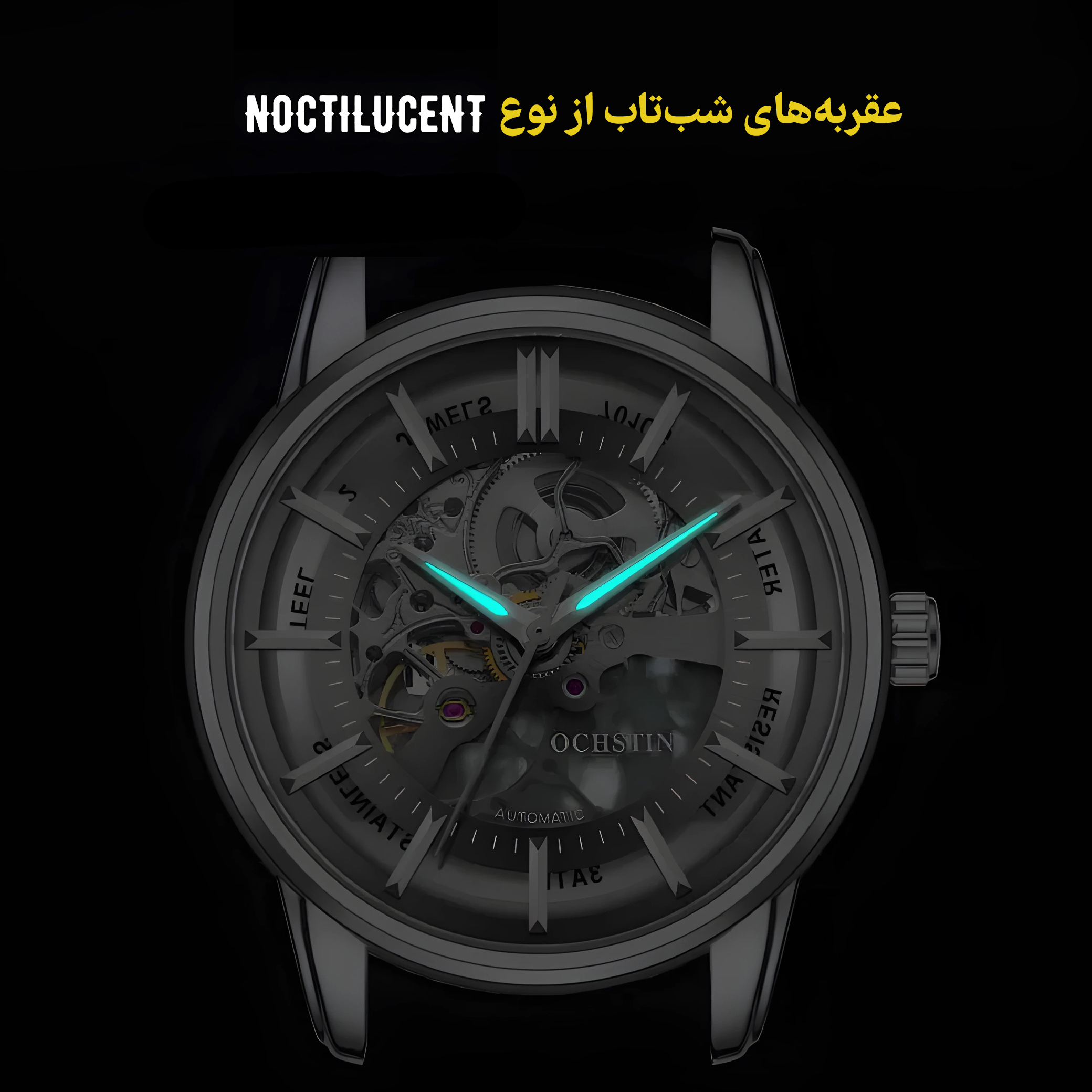 طراحی اسکلت شفاف: امکان مشاهده مکانیزم داخلی ساعت، جلوهای هنری و منحصر به فرد به آن میبخشد که توجه هر بینندهای را جلب میکند.