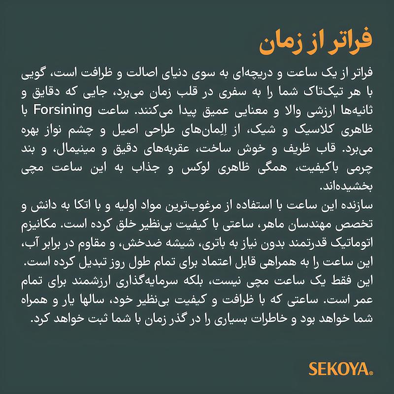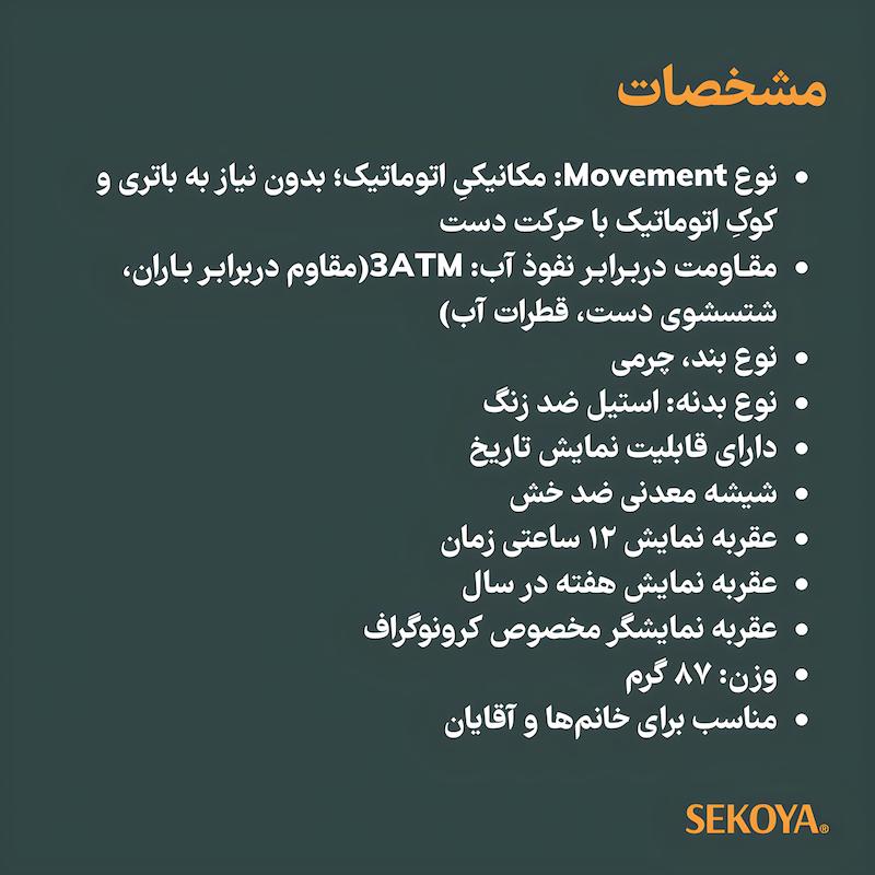 نوع Movement: مکانیکی اتوماتیک ژاپنی، بدون نیاز به باتری، شارژ با حرکت دست،